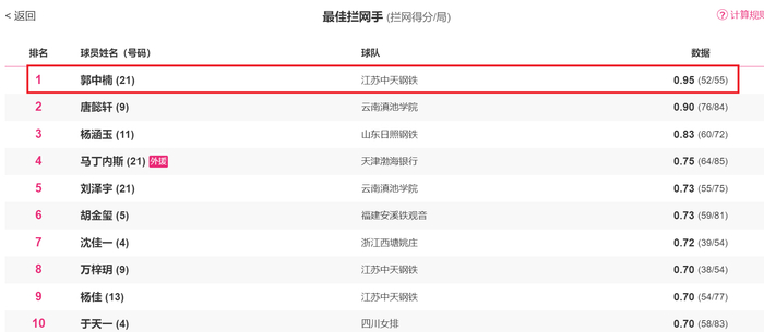 郭中楠局均拦网0.95次排名联赛第一,女排联赛B组云南队的唐懿轩0.90次排名第二,杨涵玉0.83次排名第三,天津女排外援马丁内斯0.75次排名第四。